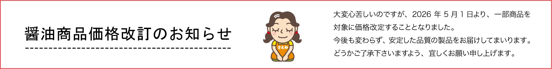 ● 醤油商品価格改定のお知らせ大変心苦しいのですが、2026年5月1日より、一部商品を対象に価格改定することとなりました。今後も変わらず、安定した品質の製品をお届けしてまいります。